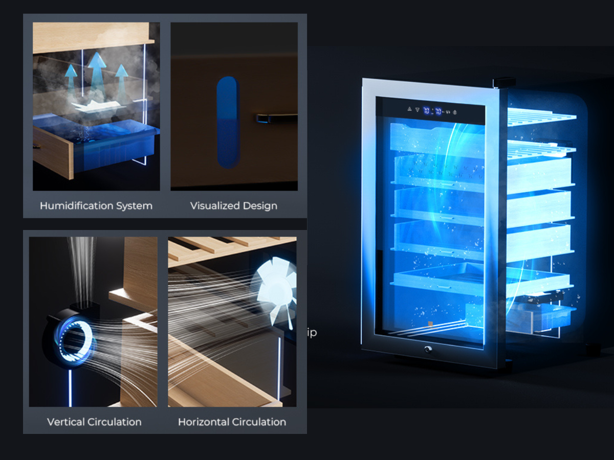 Fill the water tank with distilled water, and set your desired humicdity level. The humidor's chip processes the command, and the internal fans increase ailcirculation, distributing moisture evenly to maintain humidity levels between 60%-75%.