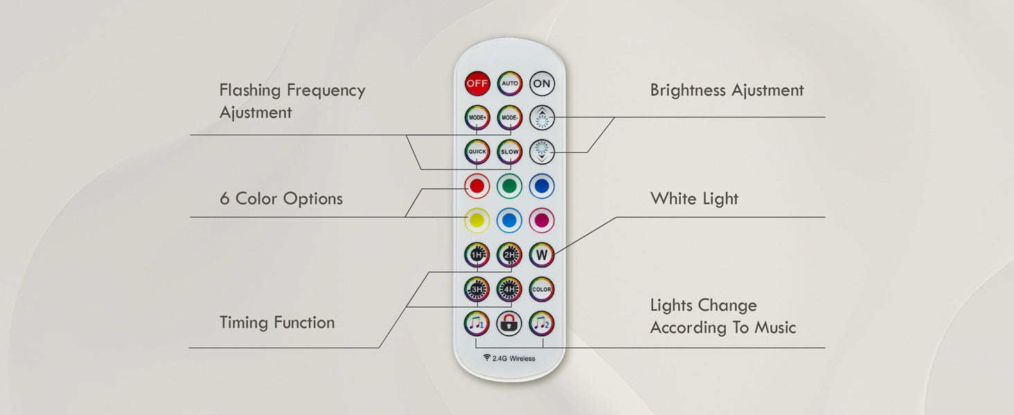Control frequency, brightness, timing, and colors with this 2.4G remote, including music-sync modes.
