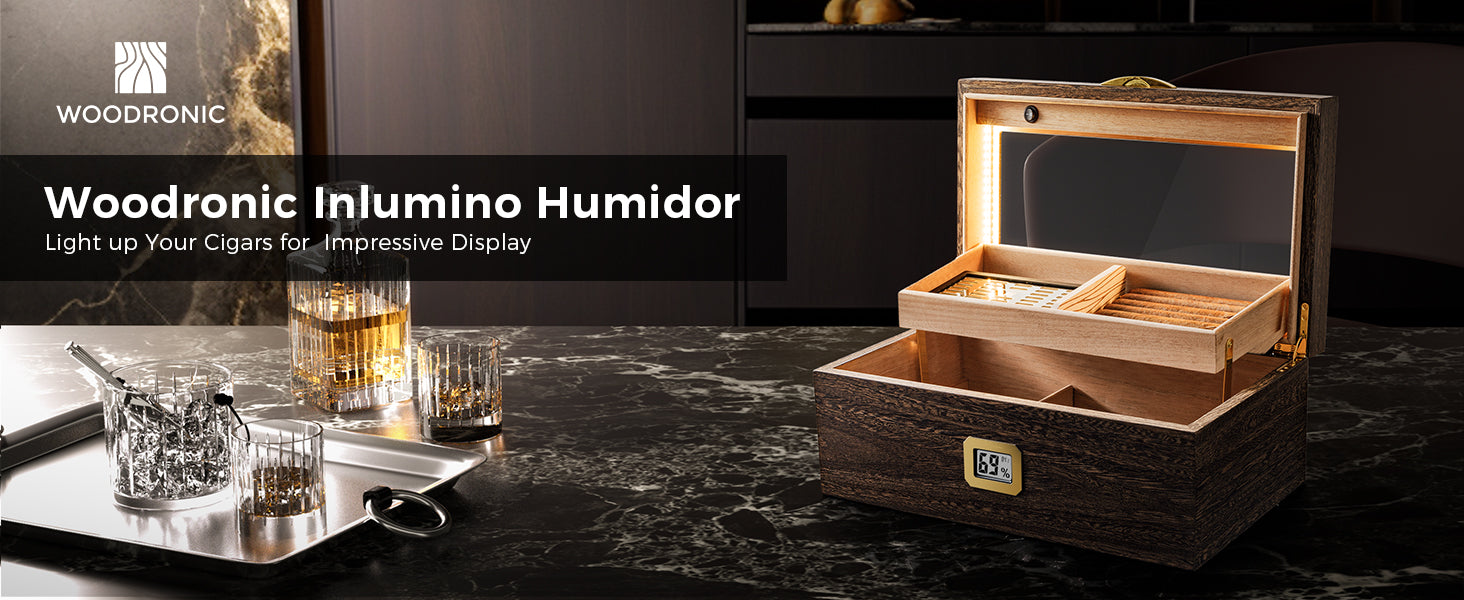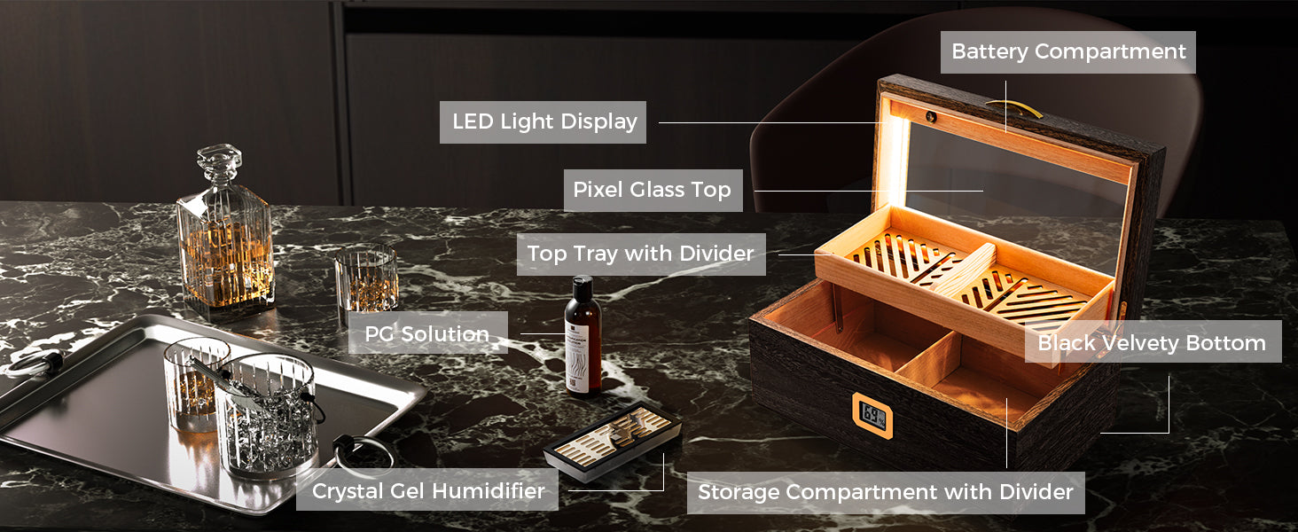 Lighted Cigar Display: The built-in LED lighting in the humidor's lid elegantly highlights your collection, allowing you to view your cigars through the pixel-glass top