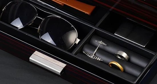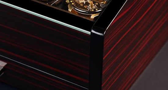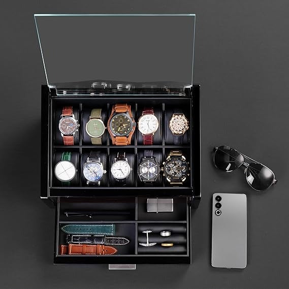 This watch organizer easily accommodates up to 10 watches, while the lower drawer provides additional space for watch straps, cufflinks and accessories, ensuring your collection remains organized and luxurious.